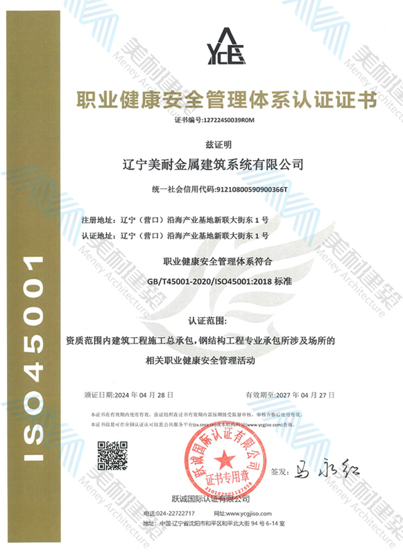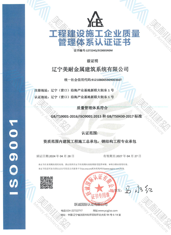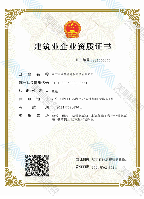 遼寧美耐金屬建筑系統(tǒng)有限公司位于遼寧(營口)沿海產(chǎn)業(yè)基地,專注于預(yù)制金屬建筑系統(tǒng)領(lǐng)域,是一家集工業(yè)建筑設(shè)計、制作、施工及相關(guān)的技術(shù)咨詢與服務(wù)為一體的綜合性服務(wù)企業(yè)。作為國家鋼結(jié)構(gòu)協(xié)會會員、中國建筑金屬結(jié)構(gòu)協(xié)會會員單位與國家高新技術(shù)企業(yè),美耐建筑集建筑工程施工總承包、鋼結(jié)構(gòu)工程專業(yè)承包等多種資質(zhì)于一身,并擁有22項(xiàng)鋼結(jié)構(gòu)建筑領(lǐng)域?qū)@?項(xiàng)軟件著作權(quán)。